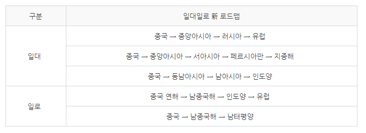 중앙아시아와 유럽을 잇는 육상 실크로드(일대)와 동남아시아와 유럽, 아프리카를 연결하는 해상 실크로드(일로)를 뜻하는 말로, 시진핑(習近平) 중국 국가주석이 2013년 9~10월 중앙아시아 및 동남아시아 순방에서 처음 제시한 전략이다.