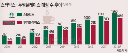 2010년부터 2018년까지 스타벅스와 투썸플레이스의 매장 수 추이를 나타낸 그래프이다.